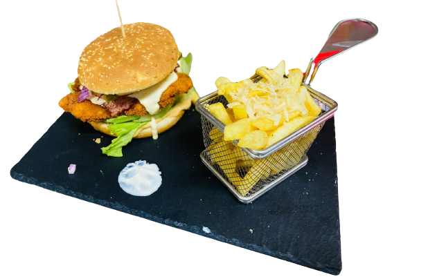 (snitel piept pui, branza cheddar, bacon, ceapa, rosii, castraveti, salata iceberg, sos, chifla, cartofi)