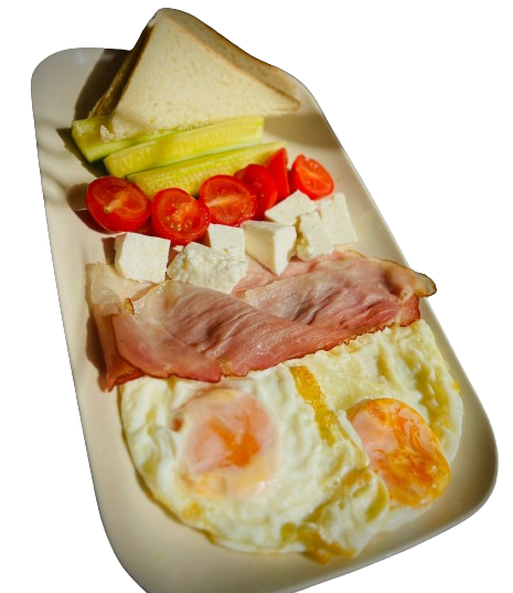 (doua oua ochiuri, branza, bacon, castraveti, rosii, paine toast)
