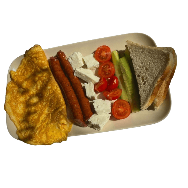 (omleta, carnati, branza, rosii, castraveti, paine toast)