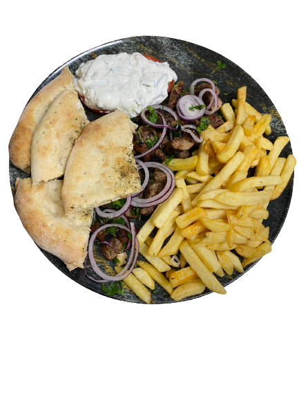 (ceafa porc, cartofi prajiti, ceapa, sos, lipie)